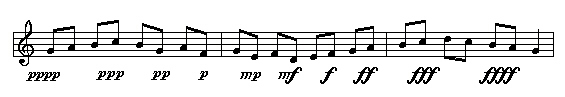 Open the Ex033 example and listen to the effect of these symbols on the sound volume of notes: