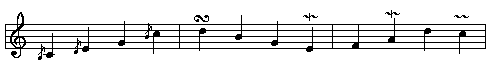 Graces notes are signs adding notes to a main note, as a decoration. The Ex036 example contains 3 grace notes in the first measure. In the second measure, the first symbol is a Gruppetto and the last 3 symbols are Mordents. Listen to the effect obtained:
