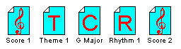 - Drag Theme 1 in the first measure. Drag then C Major into measure 1 and measure 4. Then drag F Major into measure 2 and G major into measure 3. The score finally becomes: